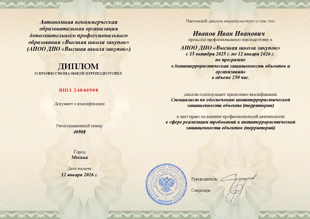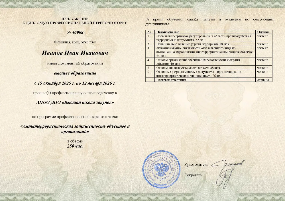 Профессиональная переподготовка, 250 академических часов, 6 модулей: нормативно-правовое регулирование и угрозы терроризма, функциональные обязанности ответственных лиц, основы безопасности и охраны объектов, анализ уязвимости и разработка необходимой документации. Онлайн-обучение в в Казани с итоговой аттестацией.