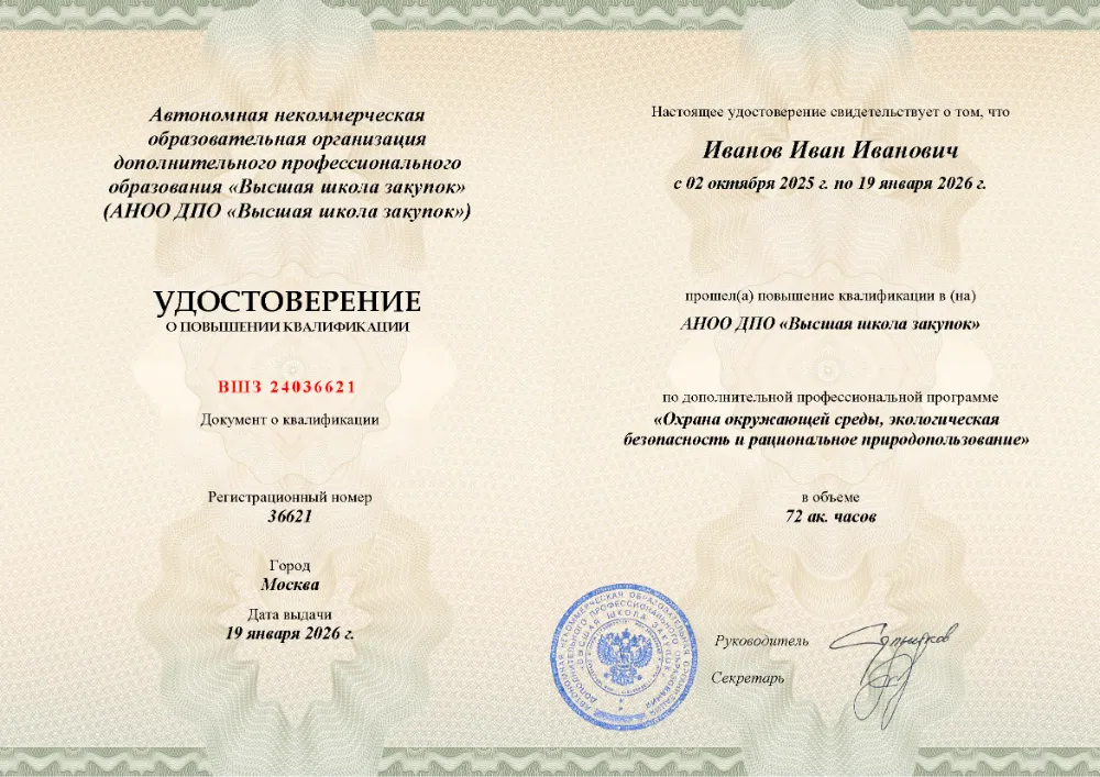 Повышение квалификации, 72 академических часа, 9 модулей: правовые основы и государственное управление в области экологии, производственный экологический контроль, документирование деятельности, система экологического менеджмента (ISO 14001) и ответственность за нарушения. Онлайн-обучение в в Казани с итоговой аттестацией.