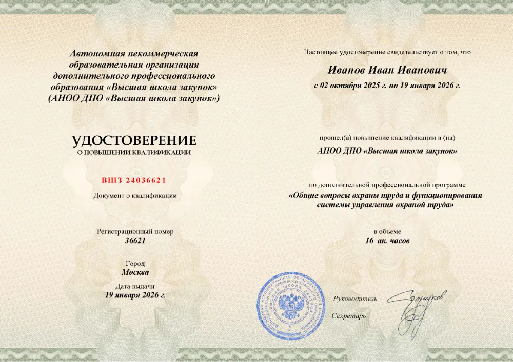Повышение квалификации, 16 академических часов, 4 модуля: правовые основы и организация системы охраны труда, управление профессиональными рисками и оценка условий труда, обеспечение безопасных условий и социальные гарантии работникам, расследование несчастных случаев и внутренний аудит системы. Онлайн-обучение в в Казани с итоговой аттестацией.