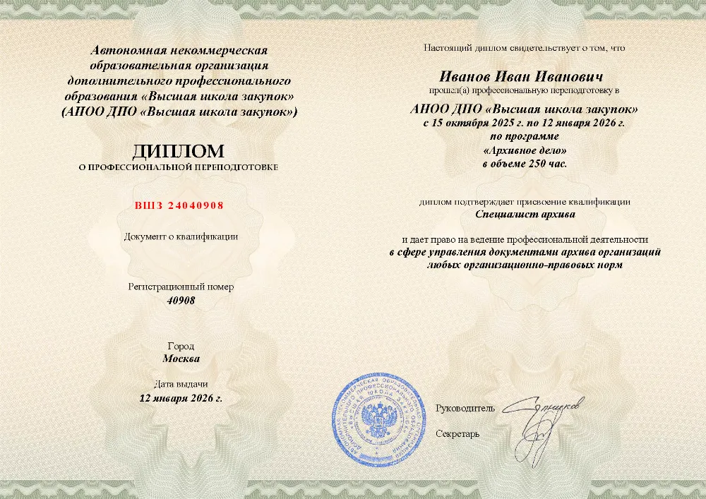 Программа профессиональной переподготовки (500 часов) для специалистов по документоведению и архивному делу. Полный курс от нормативно-правовых основ до современных технологий: экспертиза ценности документов, обеспечение их сохранности, создание поисковых систем и работа с документами по личному составу. Онлайн-обучение в в Казани с итоговой аттестацией.