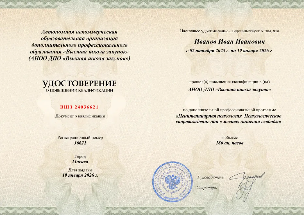 Повышение квалификации, 180 академических часов, 8 модулей: основы и структура пенитенциарной системы, социально-психологические особенности и типологии осужденных, средства исправления, работа с несовершеннолетними и деятельность психологической службы в учреждениях УИС. Онлайн-обучение в в Казани с итоговой аттестацией.